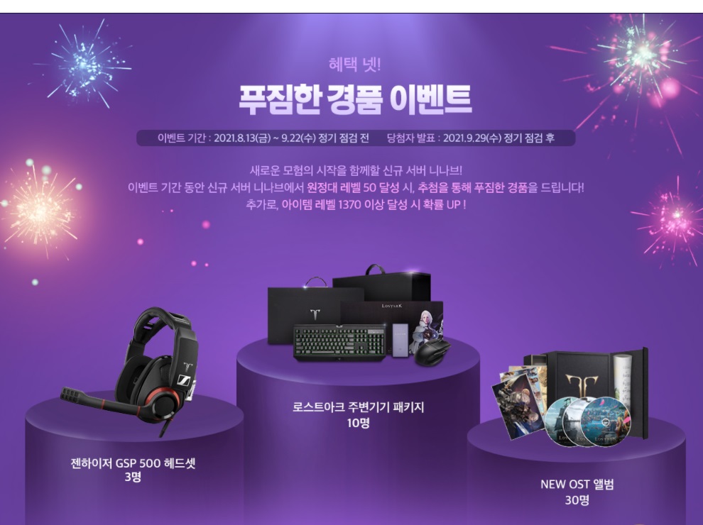 니나브 서버에서 열심히 캐릭터 키우면 추첨을 통해서 경품까지 지급한다고 합니당..