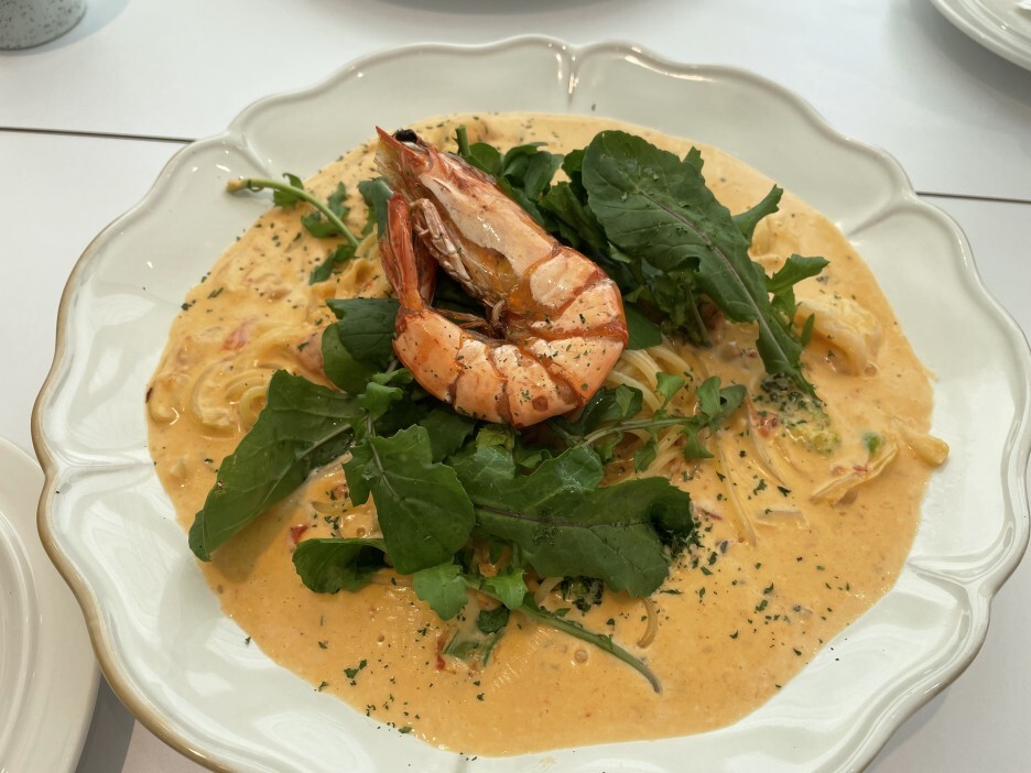 파스타 위에 루꼴라 위에 왕새우 한마리!
