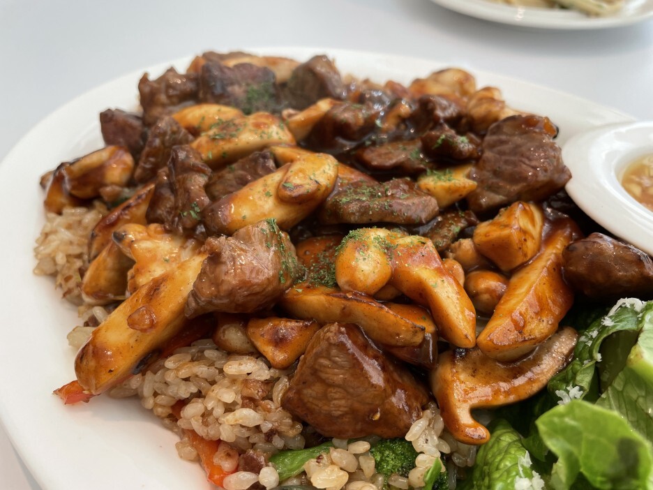 볶아진 밥 위에 스테이크와 버섯 올려져서 나오구요
