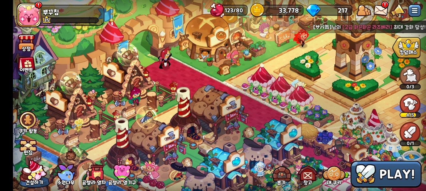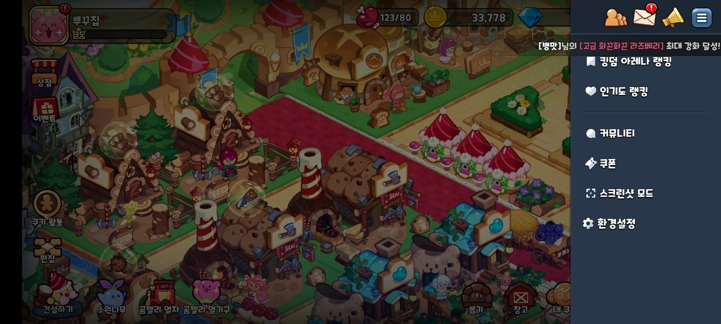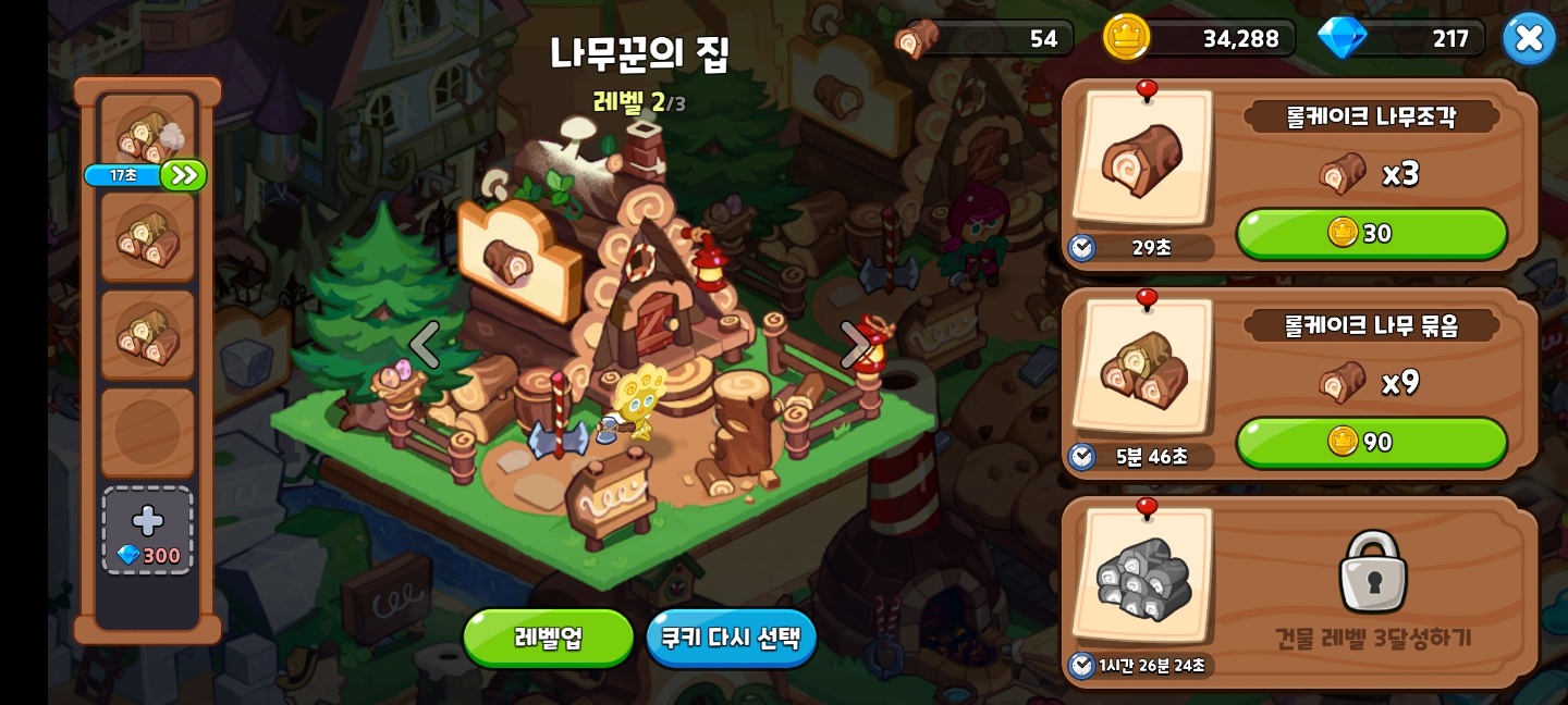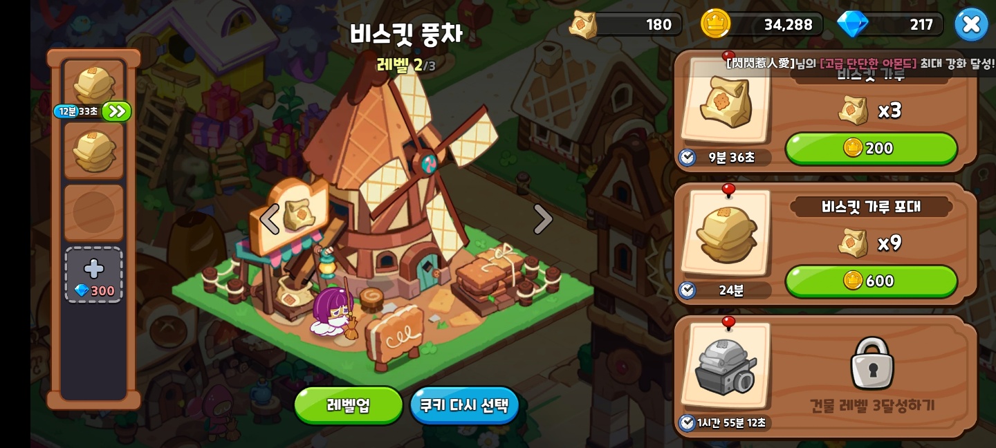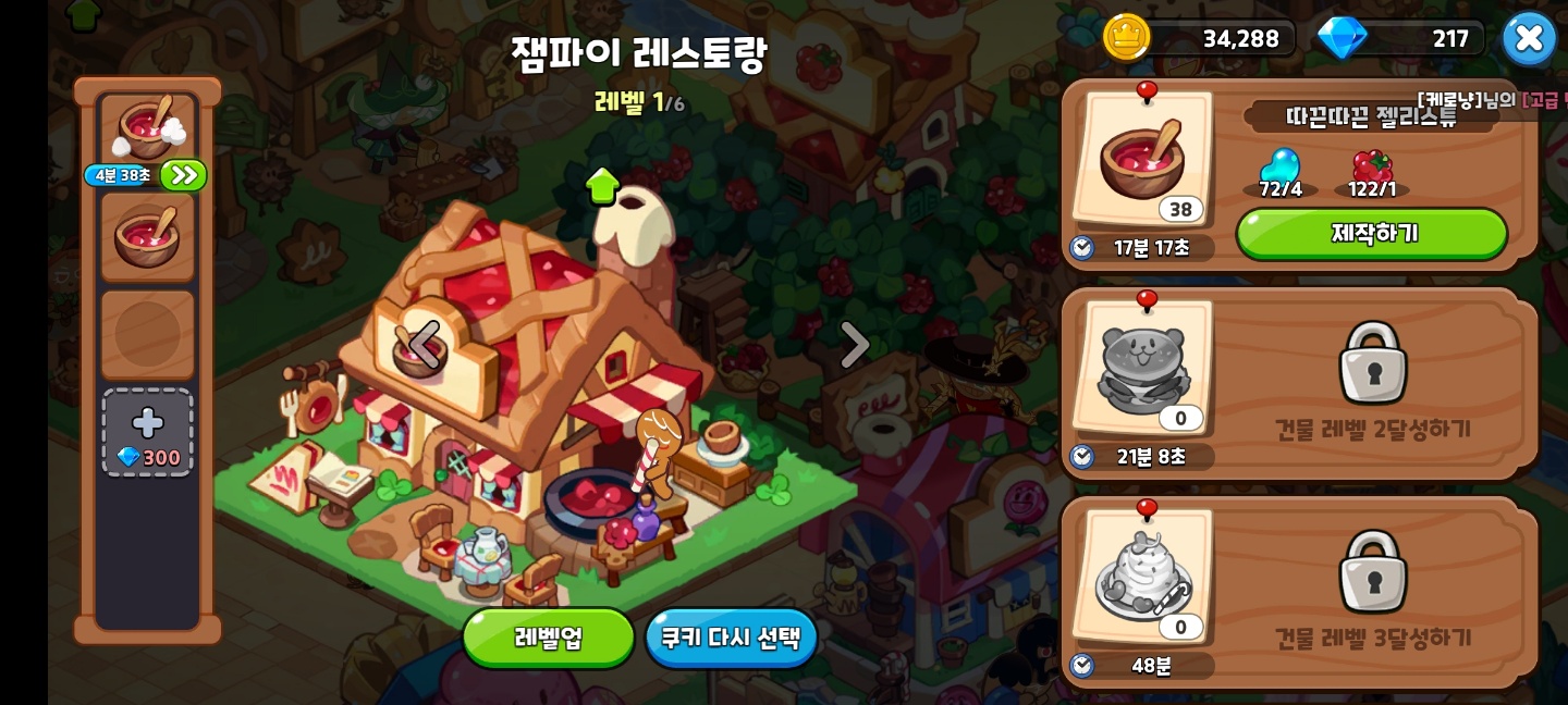 젤리베리 과수원, 잼파이 레스토랑, 비스킷 풍차, 갓 구운 빵집은 하나씩만 지어놨구요 재료생성건물만 2레벨 찍어놓고잼파이랑 빵집은 1레벨 유지중이에요 괜히 올리면 곰젤리열차랑 소원나무 돌릴때 힘들것같아서 올리지않구요