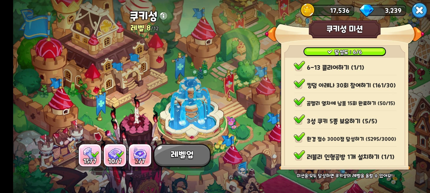 지금 쿠키성 레벨8 / 분수 레벨8 / 곰젤리열차 라인 3개 다 열었어요